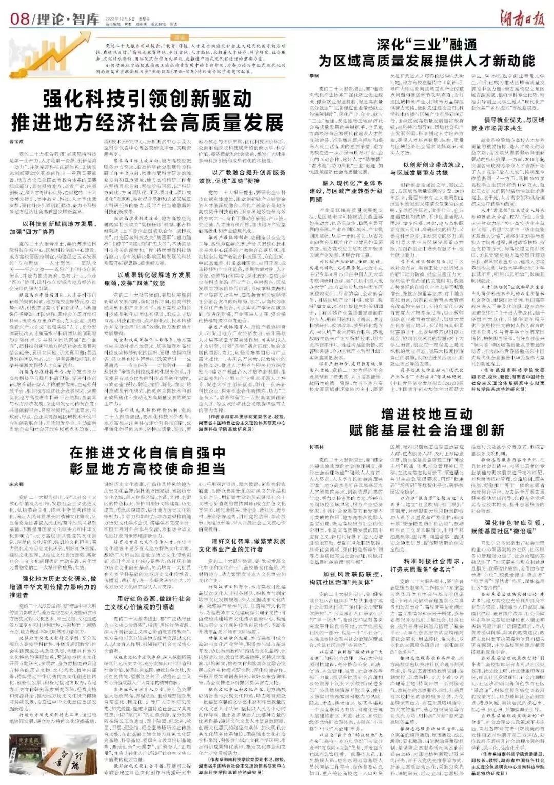 本网讯 党的二十大报告明确提出:“教育、科技、人才是全面建设社会主义现代化国家的基础性、战略性支撑。”围绕学习贯彻落实好党的二十大精神,12月8日,《湖南日报》第八版(理论·智库)整版刊发了今年会四篇理论文章,文章聚焦地方高校在推动区域高质量发展中发挥支撑作用、为奋力谱写中国式现代化的湖南新篇章贡献高校力量谈思路举措,在主流媒体发出科院声音。