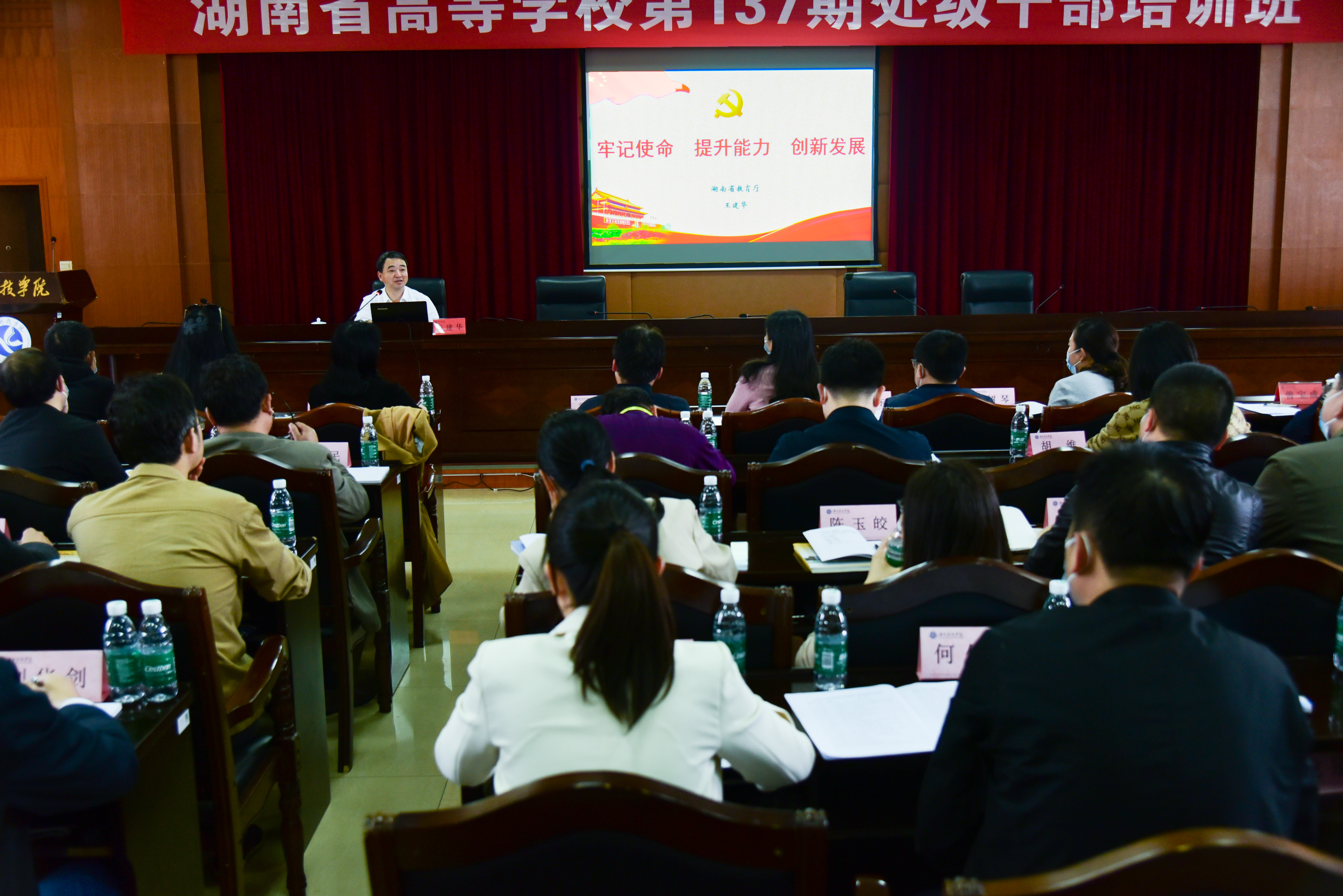 本网讯 (记者 敖露 )为加强今年会处级干部政治理论培训、夯实理论基础、增强党性修养,5月13日下午,湖南省高等学校第137期处级干部培训班开班仪式在行政楼举行。省委教育工委副书记、省教育厅党组成员、省委教育工委党校校长王建华,省委教育工委党校常务副校长、省高校干部培训中心书记、主任刘国华,校党委书记曾宝成,党委副书记宋宏福出席本次仪式。开班仪式由宋宏福主持。