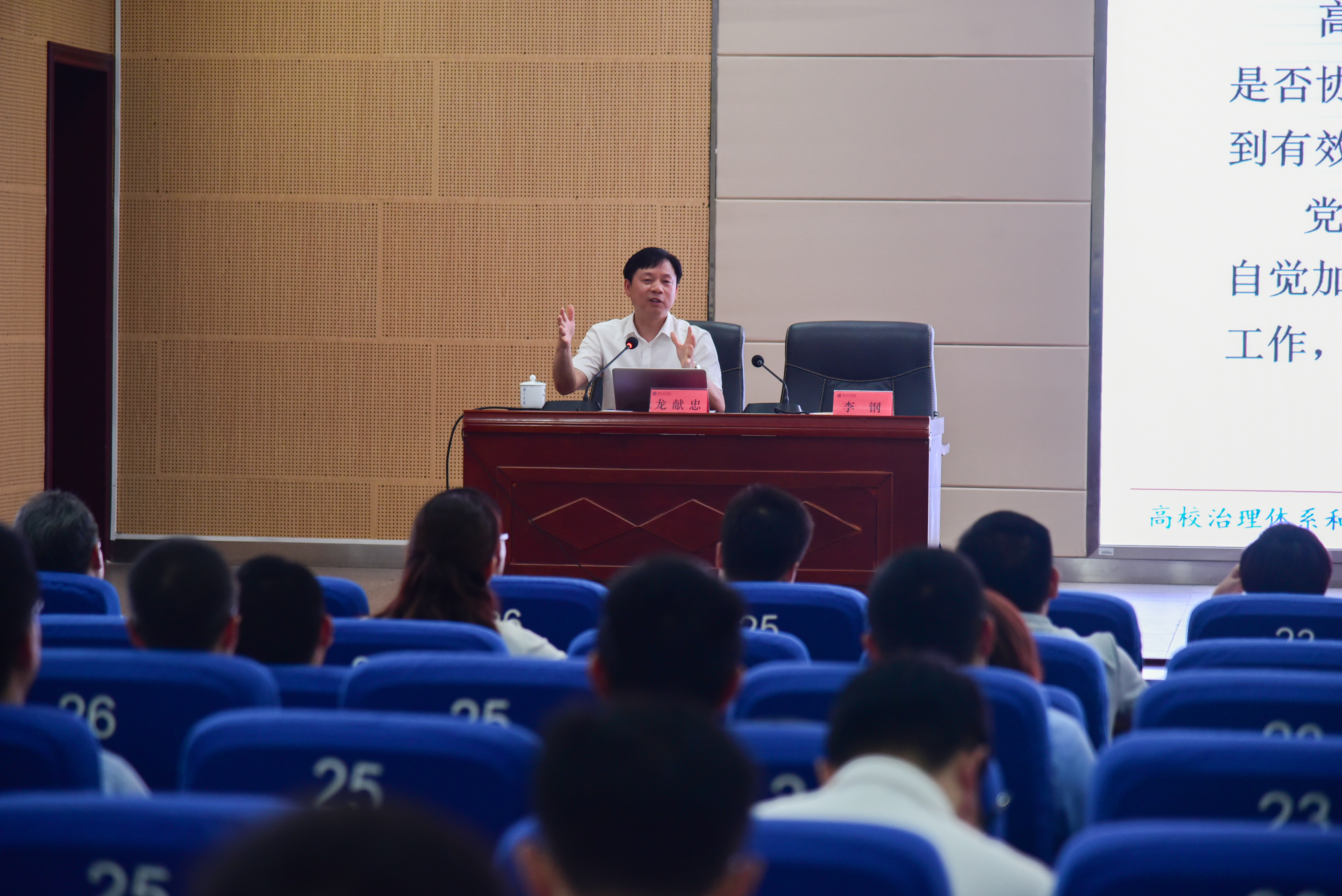 龙献忠指出,要突出高校政治服务的主导地位,按照习近平总书记指示精神:高等教育要为人民服务,为中国共产党治国理政服务,为巩固和发展中国特色社会主义制度服务、为改革开放和社会主义现代化建设服务。他强调,人的现代化是高校治理能力现代化的核心,勉励大家从“政治”“利益”“忠诚”“能力”“学习”“精神”“团结”七个方面促进人的现代化。