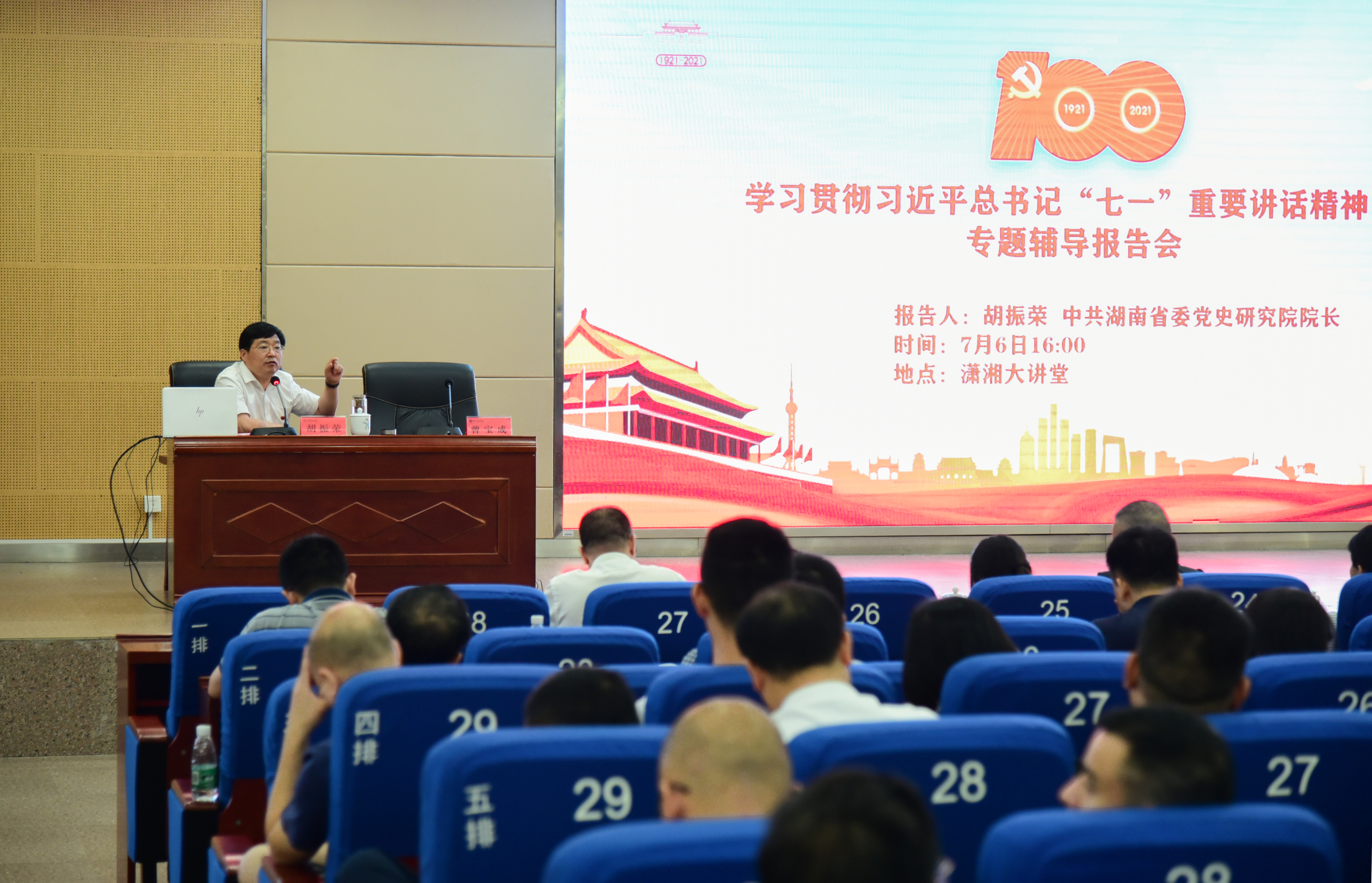 胡振荣紧扣习近平总书记“七一”重要讲话主题,为大家解读了习近平总书记“七一”重要讲话的核心要义、思想精髓和内在逻辑,详细诠释了以史为鉴、开创未来“九个必须”的根本要求,深入解读了“坚持真理、坚守理想,践行初心、担当使命,不怕牺牲、英勇斗争,对党忠诚、不负人民”的伟大建党精神。授课主题鲜明、思想深刻、内容丰富、语言通俗,体现了扎实的理论功底和丰富的实践经验,对广大师生深刻理解、准确把握、学习贯彻习近平总书记“七一”重要讲话精神具有极大的启发。大家纷纷表示,将积极响应党中央的号召,牢记初心使命,坚定理想信念,践行党的宗旨,努力为党和人民争取更大光荣!