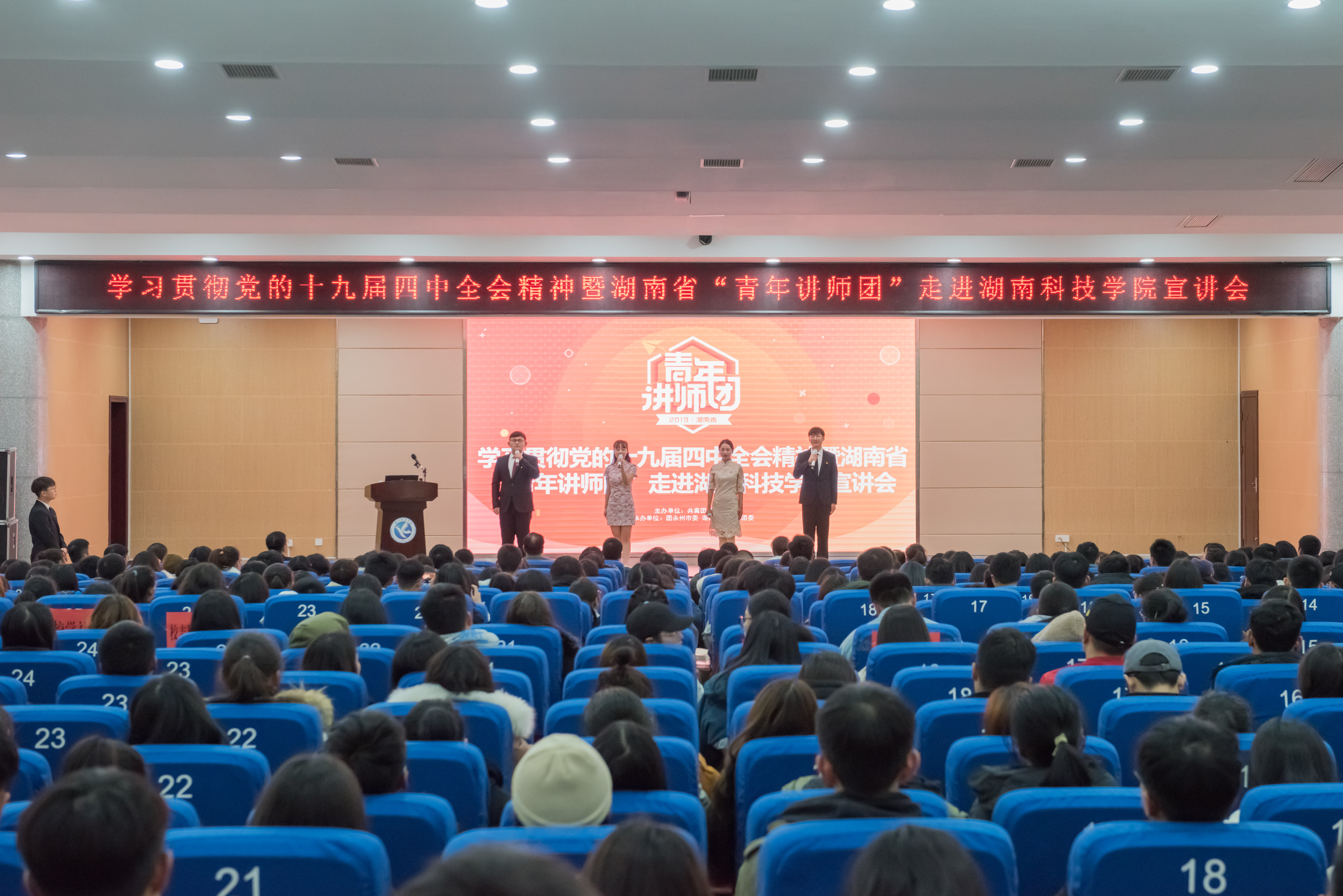 本网讯 12月19日晚,湖南省“青年讲师团”走进今年会宣讲十九届四中全会精神。青年讲师们围绕学习贯彻党的十九届四中全会精神,结合自身工作实际,以自己的亲身经历和真情实感,生动讲述祖国发展成就故事和青年追梦奋斗故事,学校800余名师生代表现场聆听。