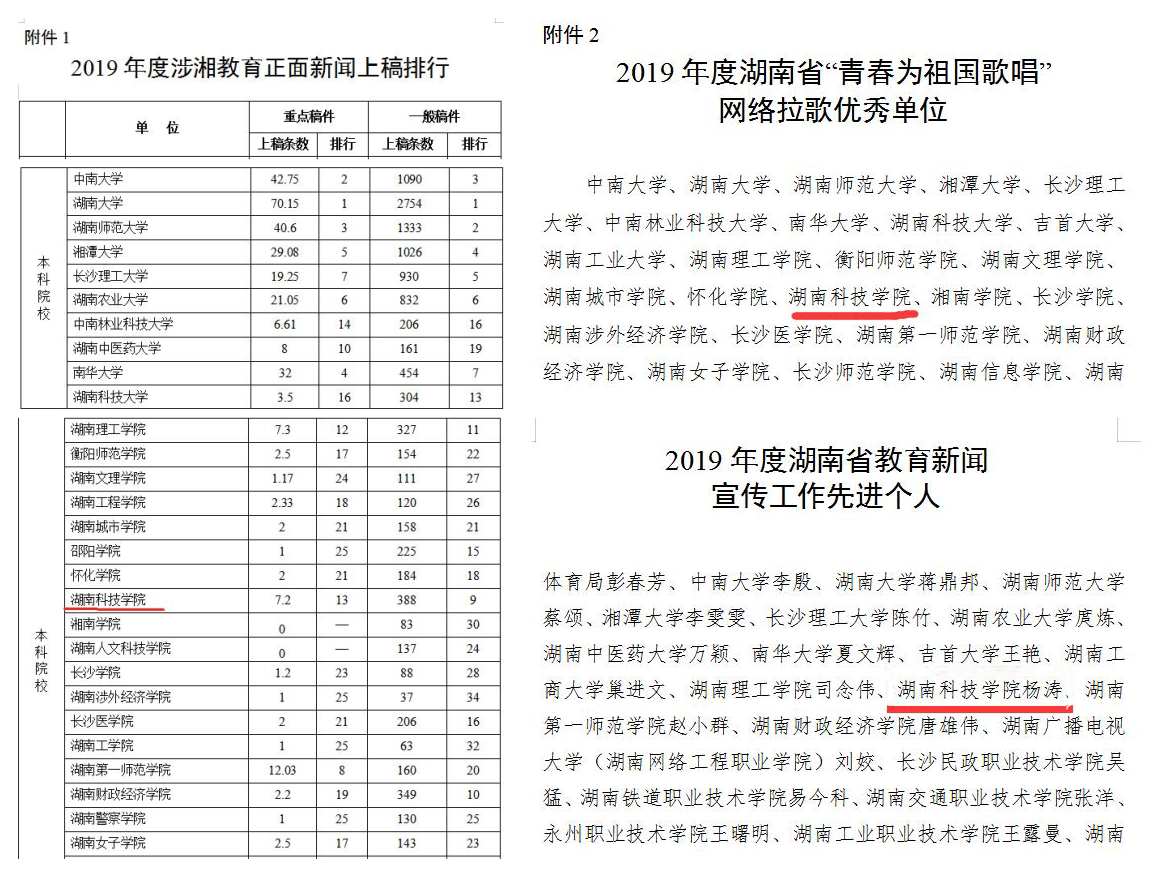 本网讯 近日,从湖南省教育厅下发的《关于2019年度全省教育新闻宣传工作情况的通报》(湘教通【2020】82号)中获悉,今年会2019年度涉湘教育正面新闻重点稿件上稿7.2篇,一般稿件上稿388篇,重点稿件和一般稿件在全省同类院校中均位列第一。学校获得2019年度湖南省“青春为祖国歌唱”网络拉歌优秀单位,杨涛同志荣获2019年度湖南省教育新闻宣传工作先进个人。