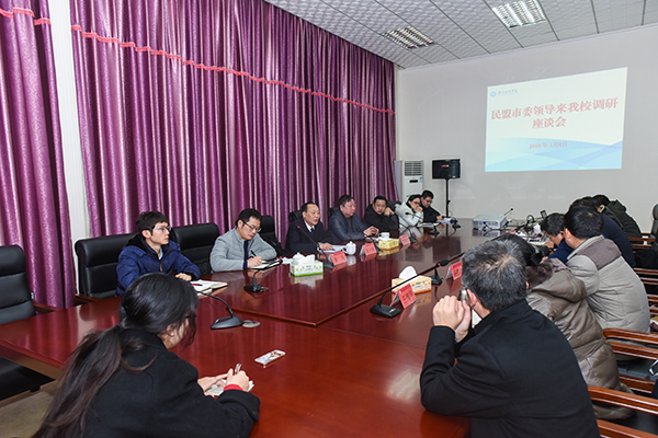 1月8日上午,永州市人大常委会副主任、民盟永州市委主委袁火林一行来校走访调研,与民盟学校支部召开座谈会。校党委副书记、工会主席唐艳明,民盟永州市委专职副主委朱衡宁,科技处处长、原民盟支部主委杨金砖,民盟学校支部主委徐大成等参加座谈会。