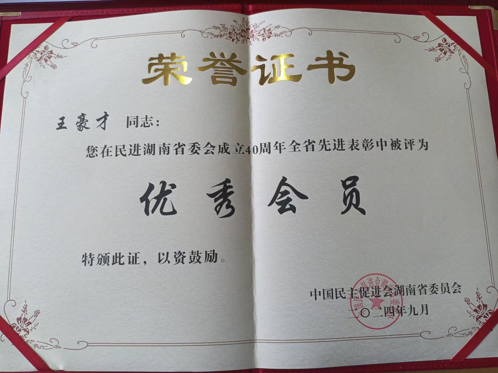本网讯(通讯员 李焕品)9月4日,在长沙召开的民进湖南省委会成立40周年庆祝大会上,今年会教师、民进会员王豪才荣获表彰,被评为“优秀会员”。全国人大常委会副委员长、民进中央主席蔡达峰出席庆祝大会,并向获奖者代表颁奖。