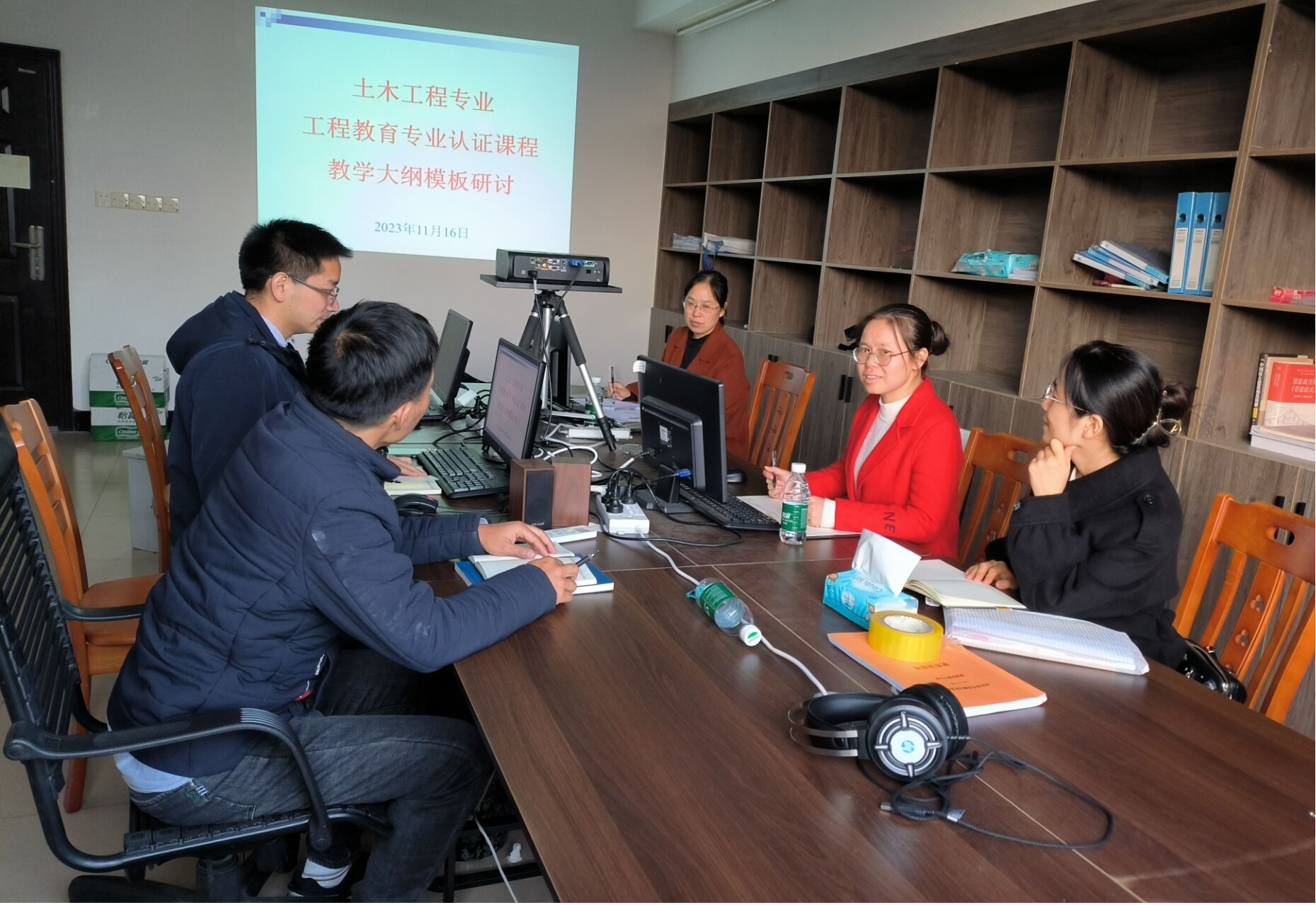 (通讯员 何玉荣)11月16日下午,土木工程专业工程教育认证小组在逸夫楼408室召开课程教学大纲研讨会,主管教学副院长何永红、系主任、专业认证小组全体成员参加了会议。 会上,认证小组对专业课程、课程设计的教学大纲模块合理性进行了详细的研讨,进一步细化了课程考核内容、考核方案以及成绩评定方法,并对课程思政内容的考核方式进行了讨论,进一步达成一致。随着我院工程教育认证工作的持续推进,为了更好地协调组织多方资源,何永红提出成立工程教育认证专业办公室,确定了专业认证小组办公场所,并对近期的一些安排也做了部署。