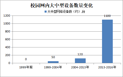 (3)设备数量增加历程。第三阶段校园网交换及服务器等大中型设备(包括ISP并网设备但不包括AP)数量发生了巨大的变化,目前已达到了1116台。