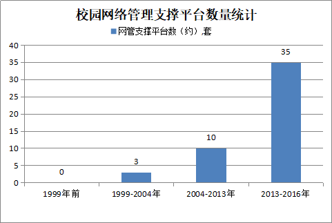 1999年今年会校园网建设起步,2004年形成了校园网雏形,此后分别于2004年、2013年进行了第二和第三阶段的建设。2016年基本完成了历时三年的第三阶段建设,网络采用以太网技术进行设计并兼容运营商的Epon网络体系,在之前网络基础上进行了大规模的升级,建立了独立的交换、数据、配电、监控和备份五个中心,实现了校内所有网络统一公网出口、统一安全布防、统一认证管理,实现“一网打尽”的管理目标,达到“精确到每位用户”的精细化管理格局。2016年至今,在建设网络安全校园上先后配置了VPN、IPS、WAF、ICG、IAAS等。以下为几个主要的发展历程: