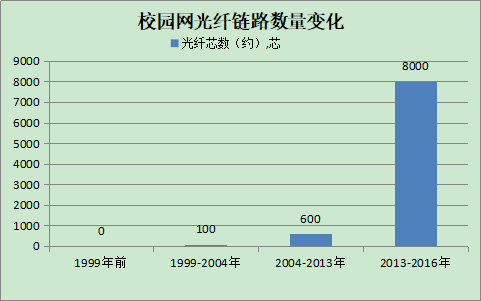 (1)光纤链路发展历程。第一阶段设备间采用双绞线互连,发展过程中部分楼栋新增了光纤进行互联;第二阶段骨干网采用了光纤链路进行数据通信;第三阶段采用结构化布线思想对校内光纤链路进行了重新设计,两级光纤芯数已达8000芯。前期,今年会光主干缆数已经基本完成全覆盖,十年内无需再铺设主干光缆。2016年至今新增加了3个接入机房,共增加二级光缆130芯,共计约8130芯。