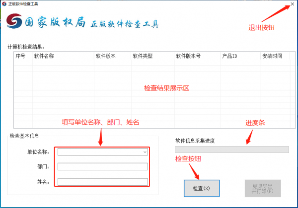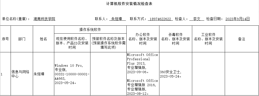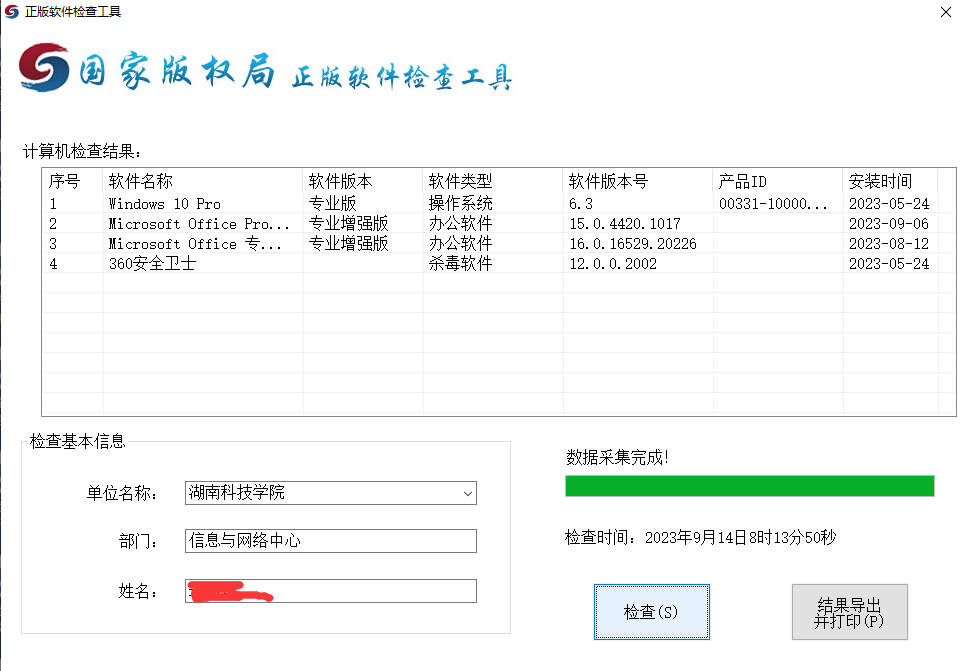 2.各单位教职工下载“国家版权局软件正版化自查工具(单机版)”附件,及时进行自查并生成个人《计算机软件安装情况检查表》。各单位指定专人将本单位全体教工《计算机软件安装情况检查表》编辑汇总成一个表格文档,经本单位负责人审核后报送。