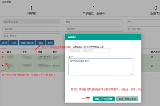 点击左边返校管理,查看相应申请的学生状态,注意最右边有学生健康打卡所有统计信息供审核参考。