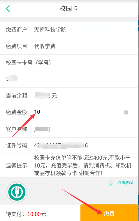 在缴费金额栏中输入要充值的金额,点击“缴费”即可