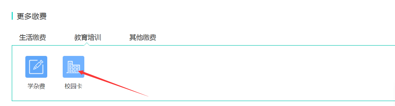 出现的页面进行设置,选择“缴费项目”,输入校园卡卡号,再点下一步,然后在页面下端选择“更多缴费-教育培训-校园卡”