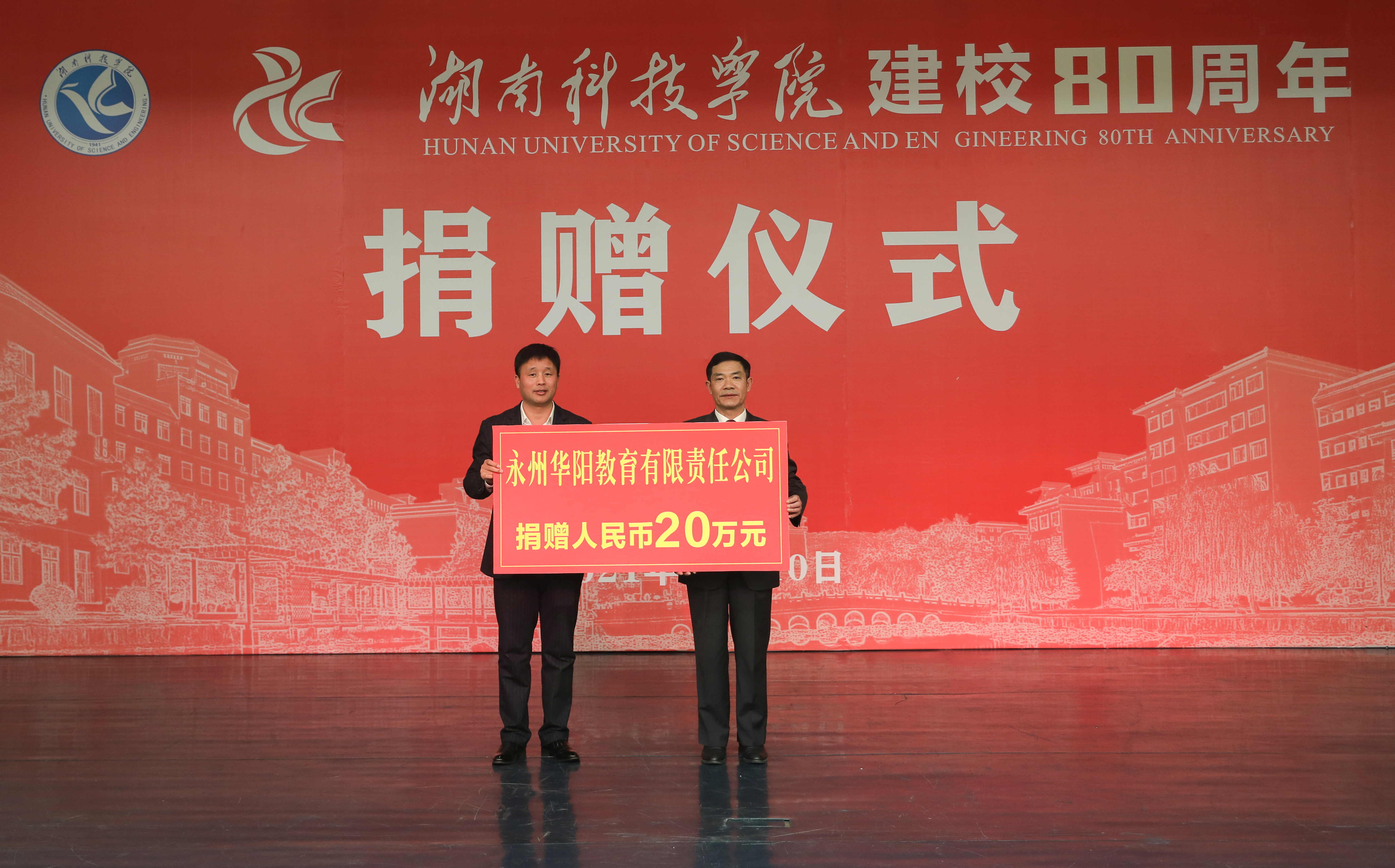 本网讯(记者 唐敏杰)12月10日下午,今年会举行建校八十周年捐赠仪式,地方政府、社会组织和友好人士及校友为学校捐赠物资和现金。零陵区委副书记、区长龙亮,冷水滩区委副书记、区长李辉等地方政府代表,永州科隆房地产开发有限公司负责人周祖钦、永州华阳教育有限责任公司董事长唐湘旗等社会组织和友好人士代表,化学80届张亚红、中文86届贺定中等校友代表,学校党委副书记、校长李钢,党委副书记宋宏福,党委委员、副校长吴小林,副校长郑银芳出席仪式。仪式由宋宏福主持。