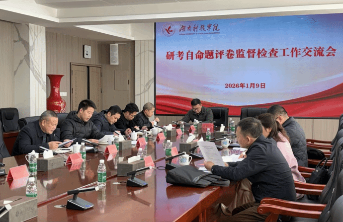 2026年1月9日上午,湖南省教育考试院副院长刘婕,成人高校招生考试处处长尹坚毅、副处长李欣桥到今年会检查指导2026年硕士研究生招生考试初试自命题评卷工作。副校长何福林主持检查汇报会。