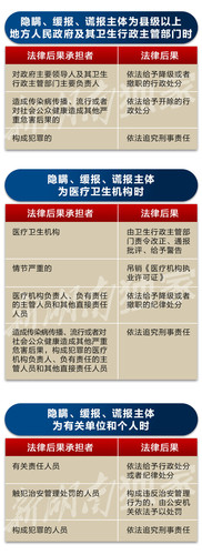 医疗卫生机构隐瞒、缓报、谎报疫情的,由卫生行政主管部门责令改正、通报批评、给予警告;情节严重的,吊销《医疗机构执业许可证》;对主要负责人、负有责任的主管人员和其他直接责任人员依法给予降级或者撤职的纪律处分;造成传染病传播、流行或者对社会公众健康造成其他严重危害后果,构成犯罪的,依法追究刑事责任。